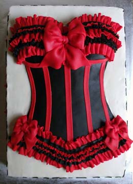 Red and black ruffle corset and bow dress cake no body